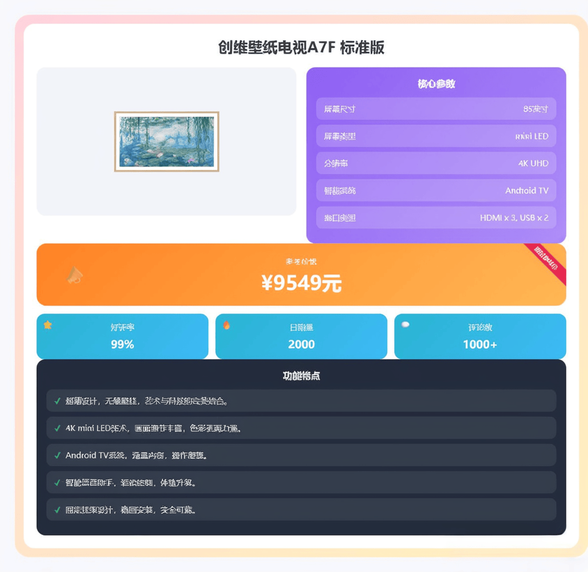 除了形态,它的画质表现也是旗舰级的。它采用了独立的画质芯片进行调校,色彩还原非常精准,层次感丰富。同时,作为一款强调艺术融入生活的产品,它内置了丰富的艺术画廊资源,待机时可以变身为一幅世界名画或摄影作品,让电视在不开的时候也成为客厅的装饰亮点。音质方面通常也会配备功率更大的音响系统,音画合一的效果很出色。