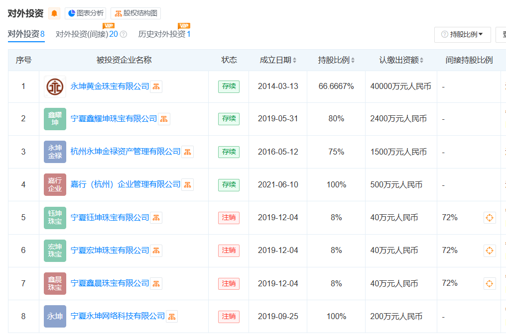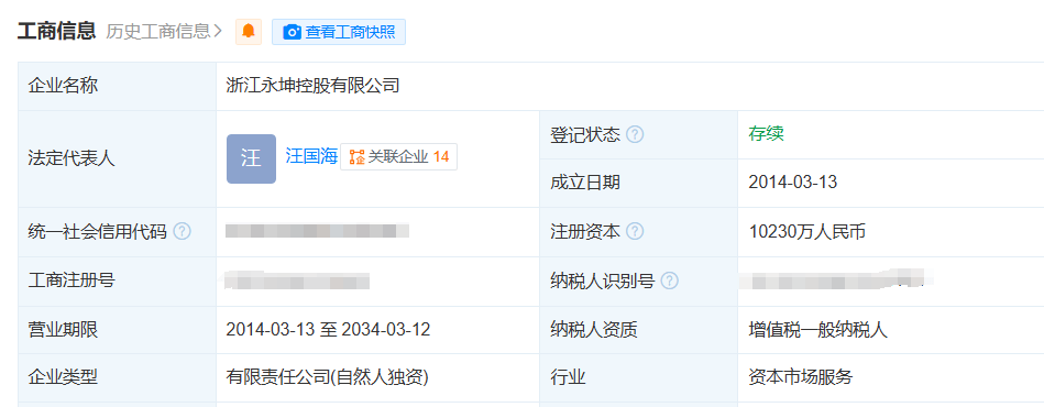 天眼查显示,永坤黄金的经营实体为浙江永坤控股有限公司,成立于2014年,实控人为汪国海。